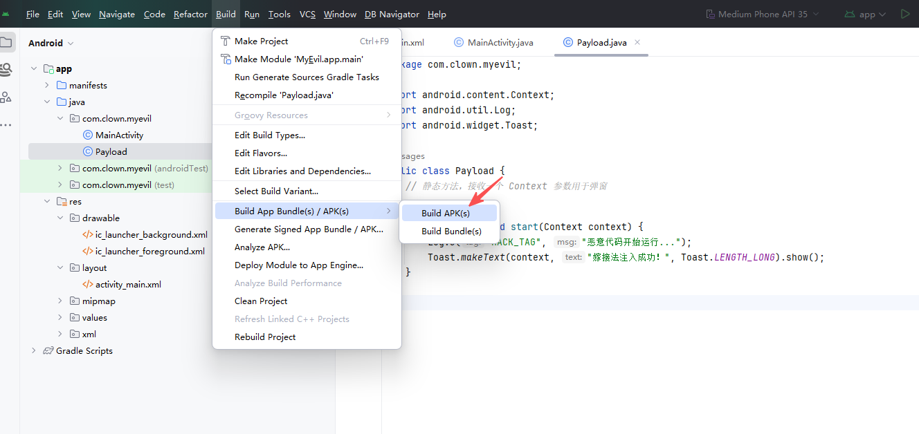 接下来我们去修改一下增加一些代码进行测试,常用的方式是”Smali嫁接法“,就是先用java写好恶意逻辑,编译成apk,反编译拿到Smali,然后复制到前面的目录当中,最后在主程序插桩调用它。