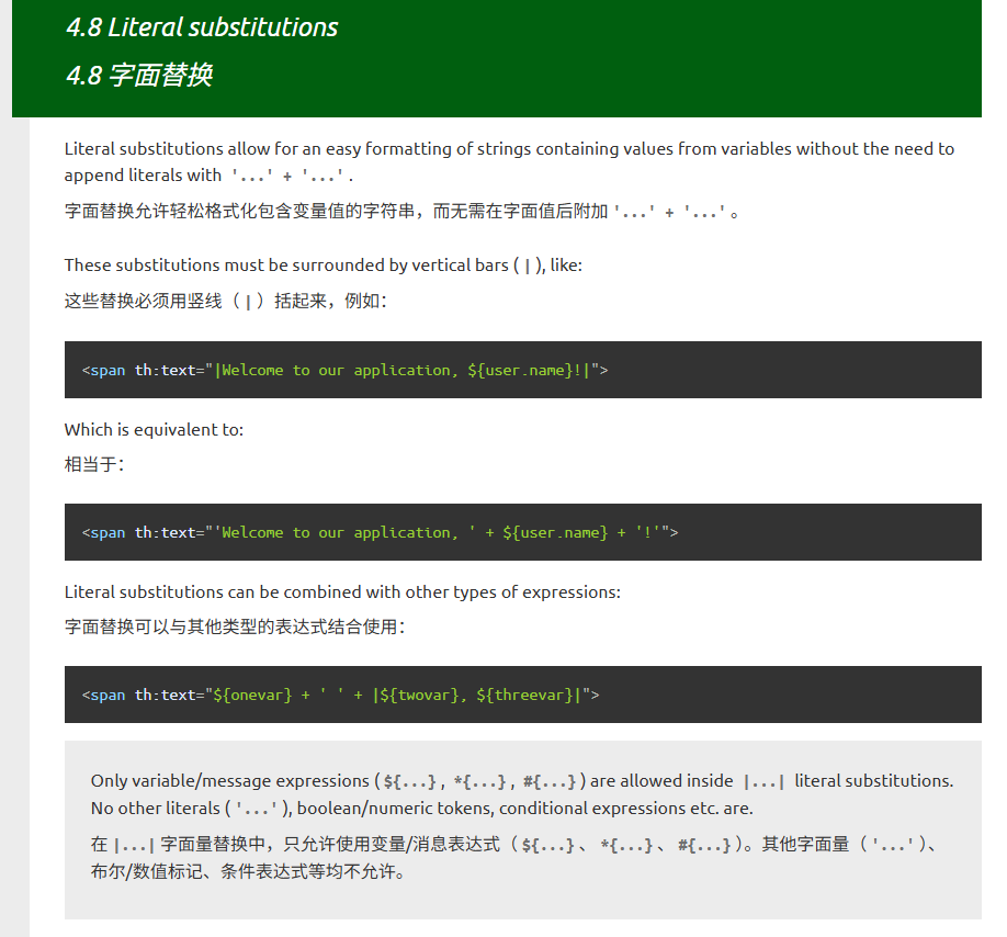根据大佬的文章,我们可以在官方文档中找到思路:https://www.thymeleaf.org/doc/tutorials/3.0/usingthymeleaf.html#literal-substitutions