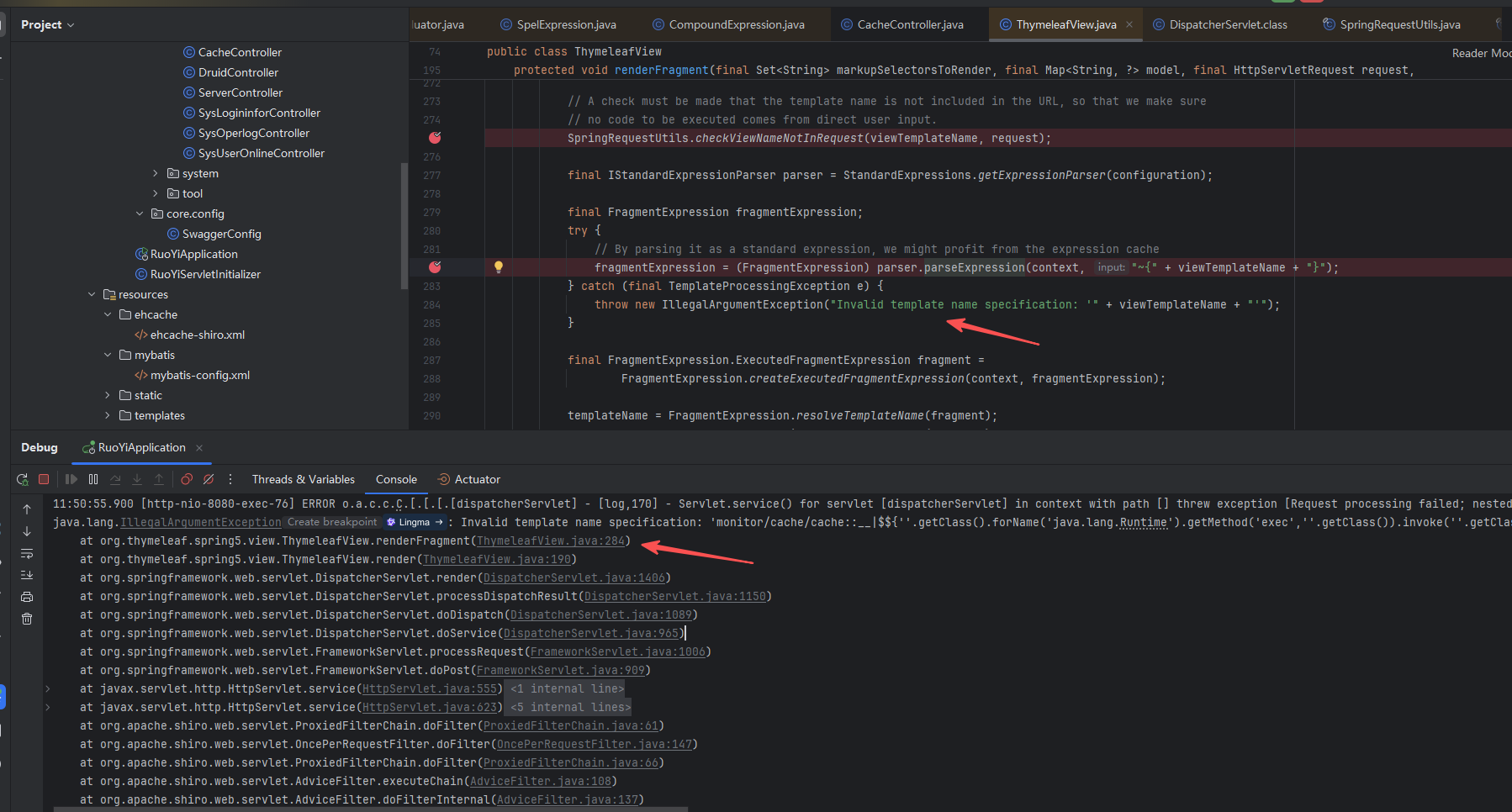因为是Thymeleaf的问题,所以漏洞存在于Ruoyi的单体应用版本